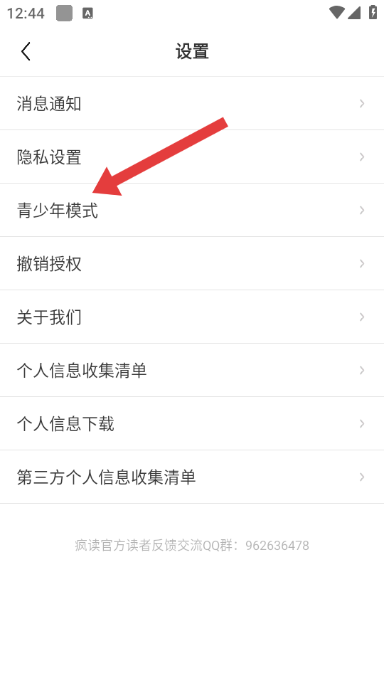 3、在設(shè)置界面,點擊青少年模式選項,進(jìn)入青少年模式設(shè)置頁面。