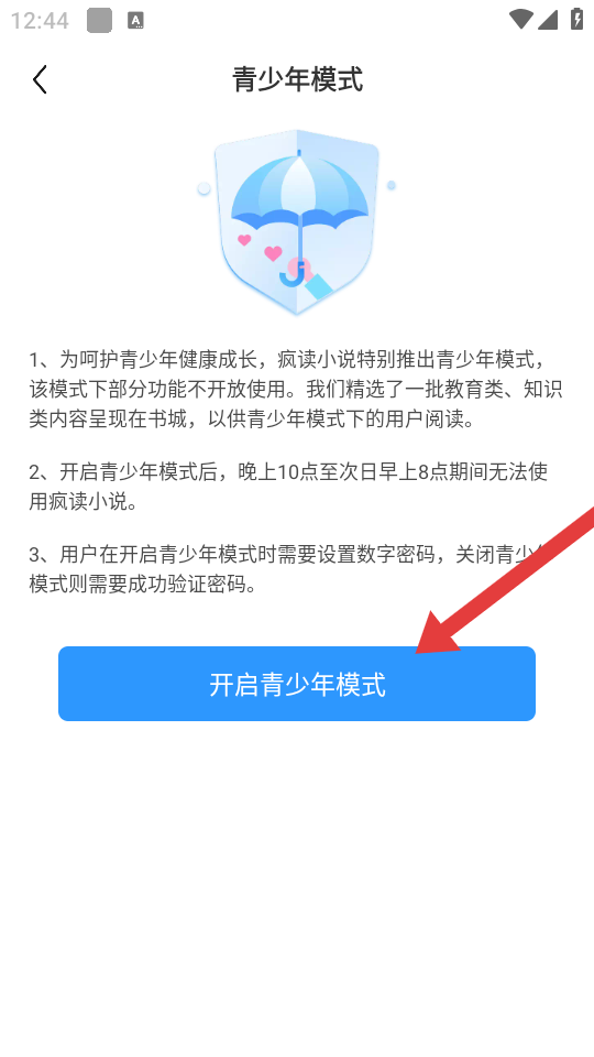 4、在頁面點擊開啟青少年模式按鈕,按提示設(shè)置密碼后,即可開啟青少年模式。