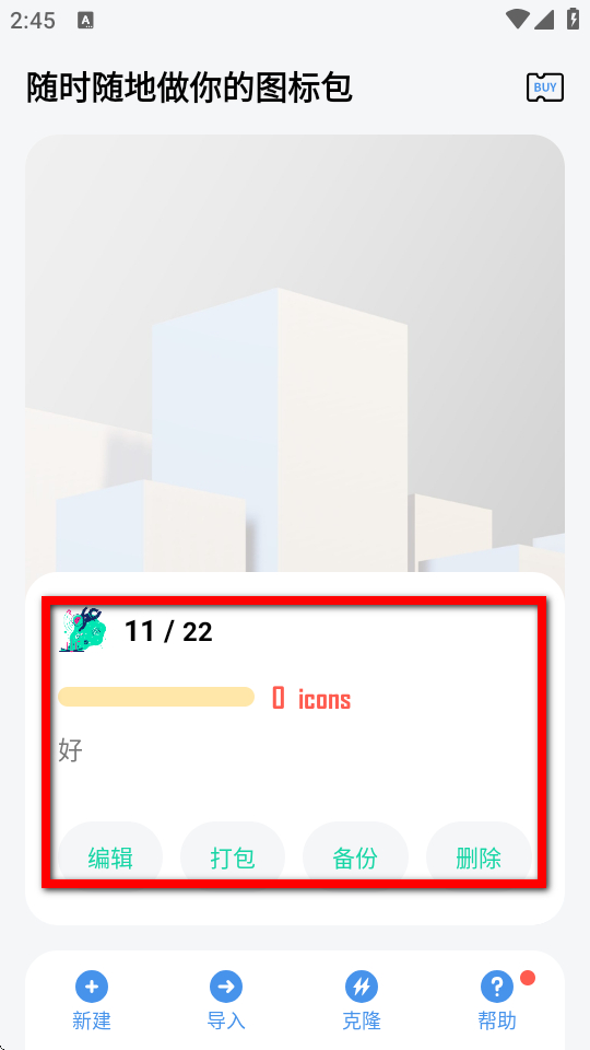 -- 本應用以圖標包為基本單位,首頁可點擊添加按鈕創(chuàng)建不同的圖標包實例。對于每個實例,圖標包的logo將會作為導出apk的logo,名稱將會作為導出apk的名稱,作者也將會體現(xiàn)在導出apk的信息頁面。
