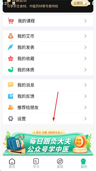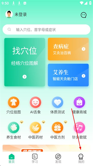 1、打開灸大夫app,進(jìn)入首頁(yè),點(diǎn)擊底部導(dǎo)航欄中的我的選項(xiàng)。