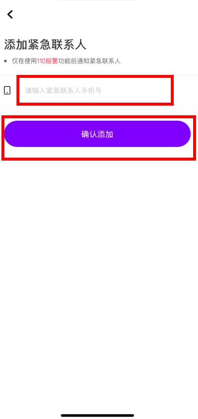 3、在添加緊急聯(lián)系人界面,輸入緊急聯(lián)系人的手機號,然后點擊確認添加按鈕,即可成功添加緊急聯(lián)系人。