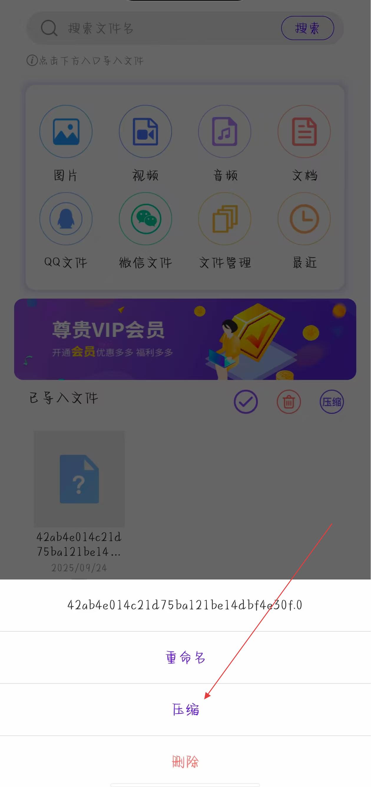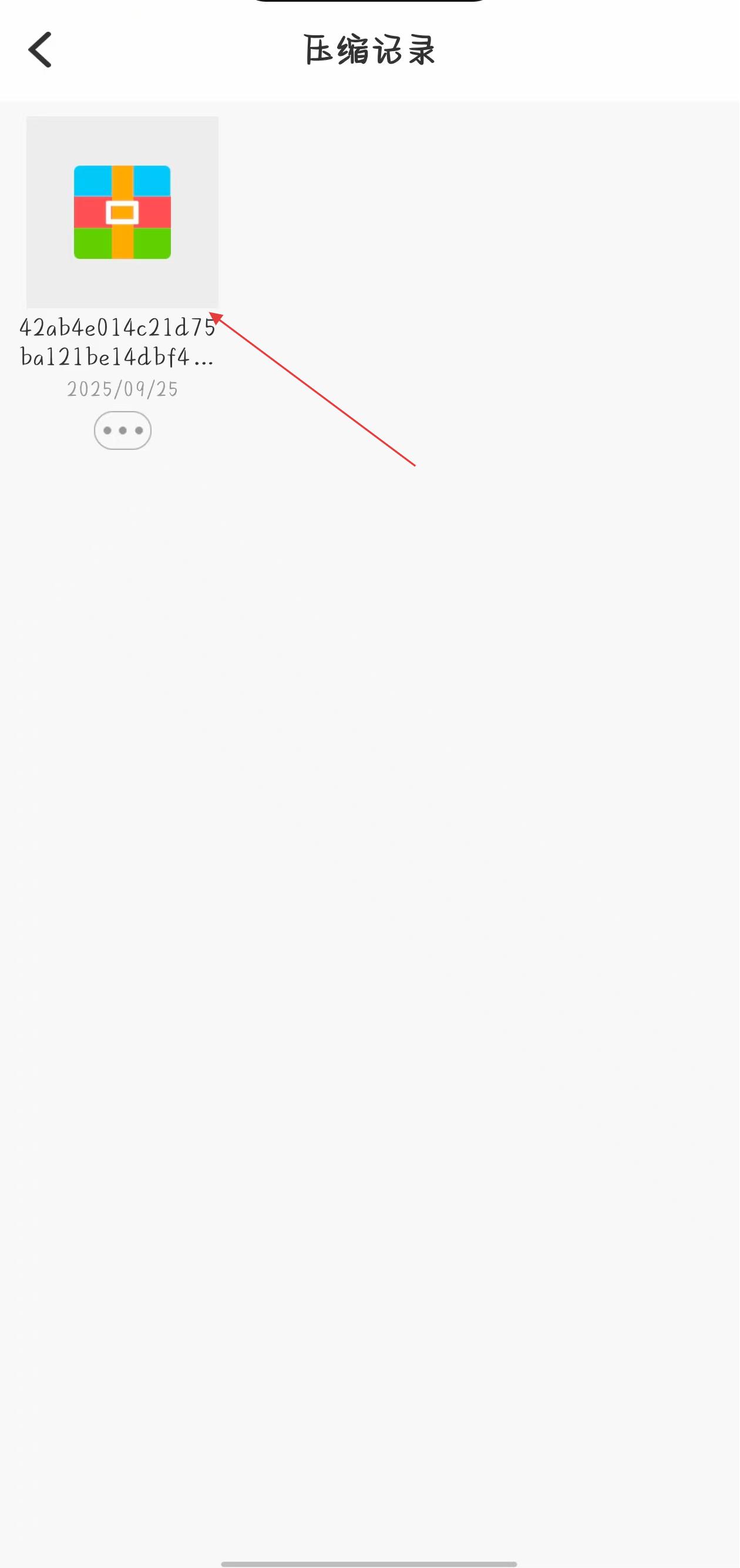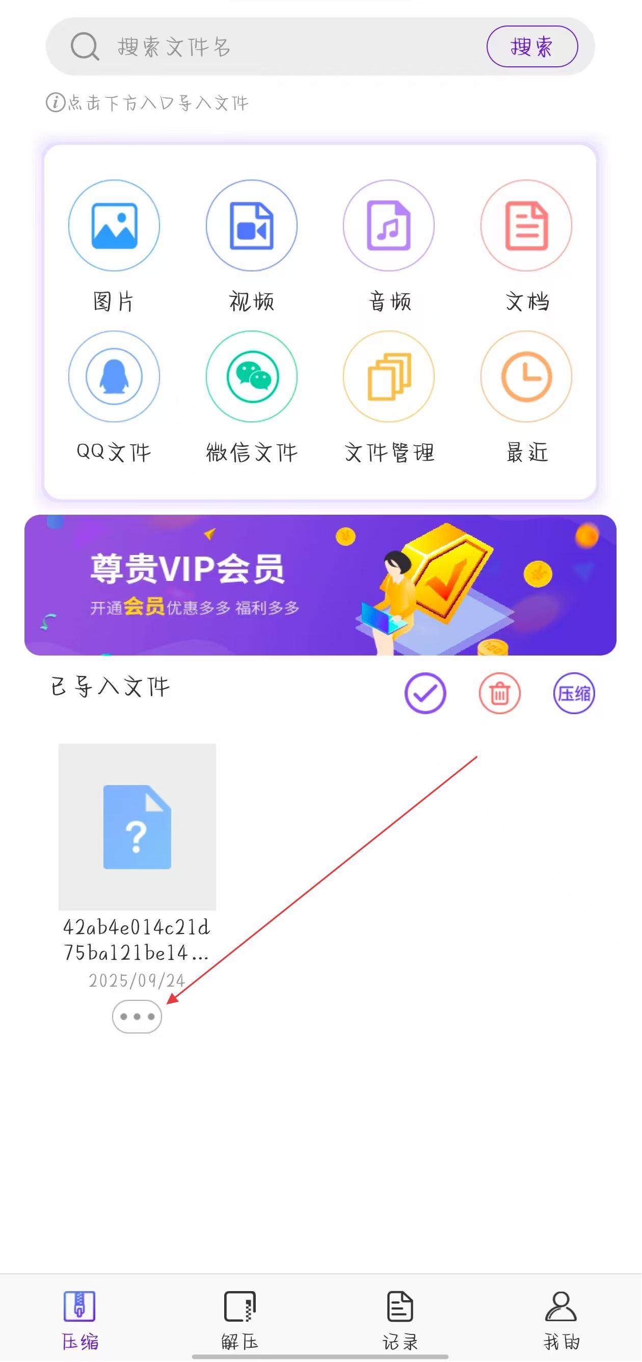 1、打開解壓縮應(yīng)用,在已導(dǎo)入文件區(qū)域找到需要壓縮的文件,點擊該文件下方的三個點圖標(biāo),彈出操作選項菜單。