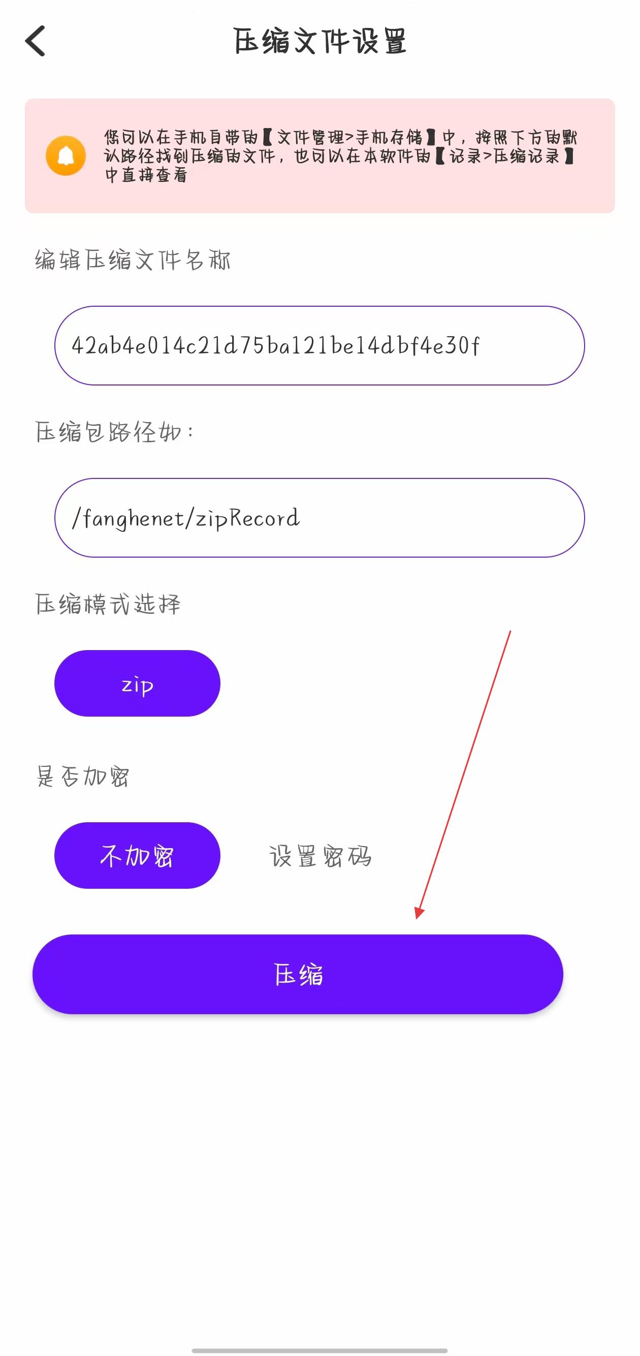 3、在壓縮文件設(shè)置頁面,可編輯壓縮文件名稱、選擇壓縮目標(biāo)路徑、選擇壓縮格式,還可設(shè)置是否加密,確認(rèn)各項設(shè)置后,點擊頁面下方的壓縮按鈕。