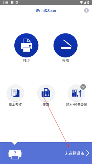 1、打開iPrint&Scan應(yīng)用,點擊底部未選擇設(shè)備區(qū)域。