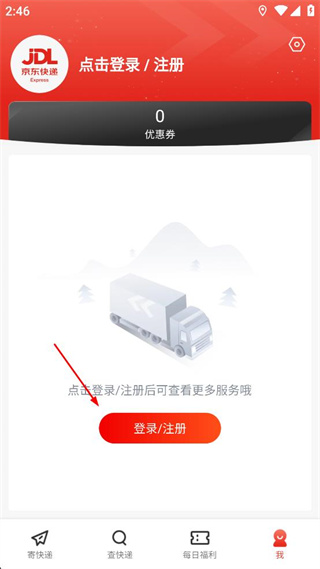 2、在個(gè)人頁(yè)面中,找到登錄注冊(cè)按鈕,點(diǎn)擊該按鈕進(jìn)入京東快遞的登錄界面。