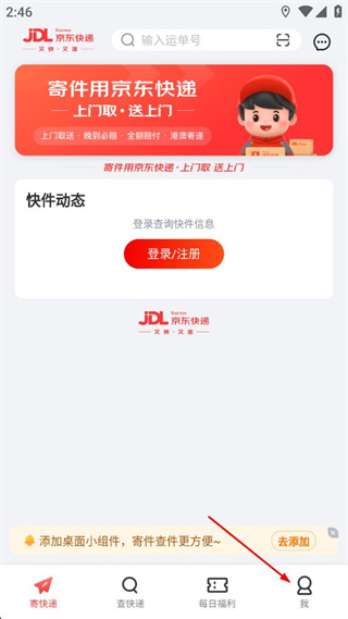 1、進(jìn)入京東快遞首頁(yè),找到底部導(dǎo)航欄的我選項(xiàng),點(diǎn)擊該選項(xiàng)進(jìn)入對(duì)應(yīng)的個(gè)人頁(yè)面。