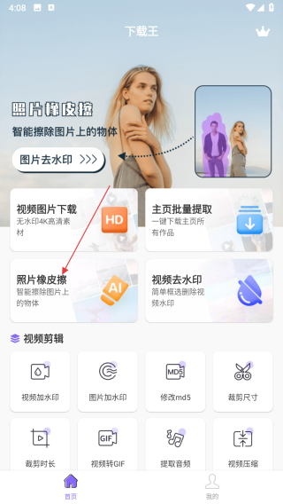 1、打開下載王APP,在主界面找到并點(diǎn)擊照片橡皮擦功能選項(xiàng),進(jìn)入圖片橡皮擦操作頁面。