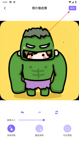 4、預(yù)覽確認(rèn)擦除效果符合預(yù)期后,點(diǎn)擊界面右上角的保存按鈕,將處理好的圖片保存。