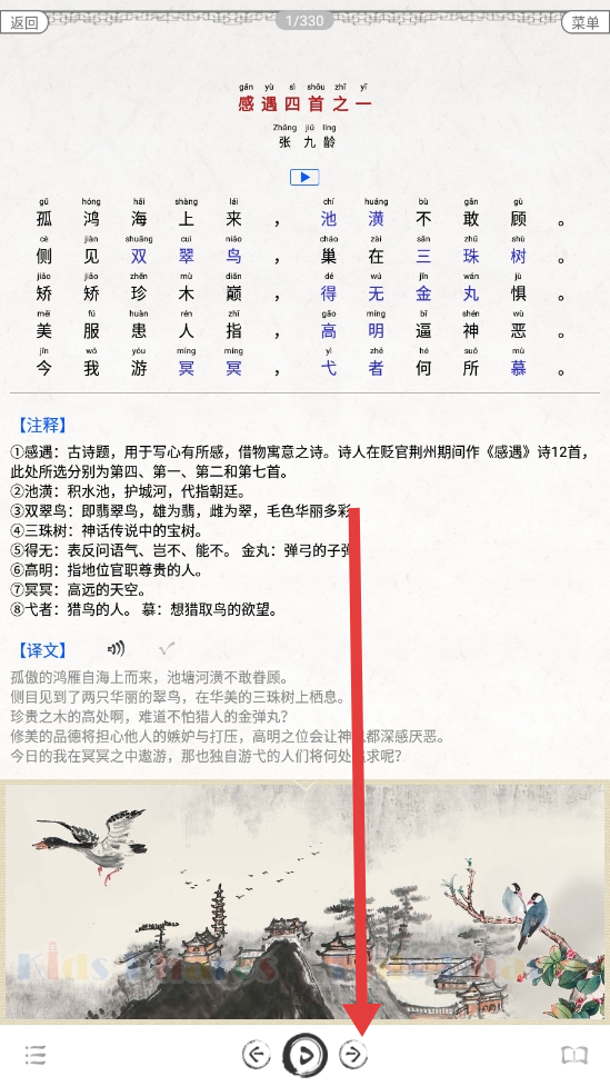 2、在唐詩詳情頁,點擊底部右側切換按鈕,跳轉至下一章《感遇四首之二》,繼續(xù)瀏覽詩歌解析與賞析內容。