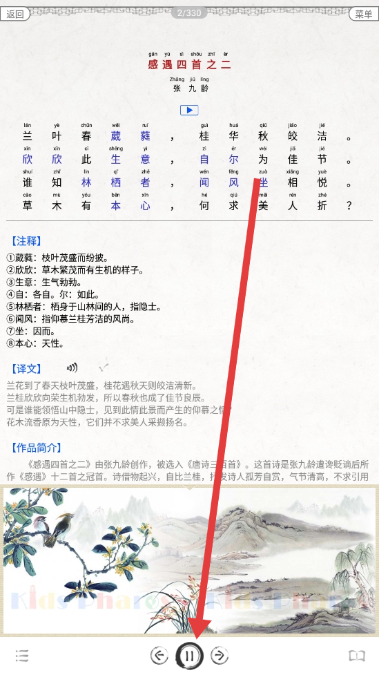 3、在第二章唐詩頁面,點擊底部中間播放按鈕,聽取詩歌的語言介紹,借助音頻加深對詩歌的理解。