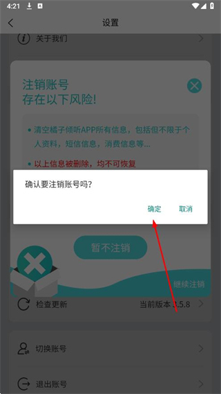 5、在新彈出的確認框中,點擊確定,完成賬號注銷操作。