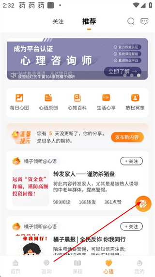 1、在橘子傾聽App首頁點擊底部的心語選項,進入心語頁面。