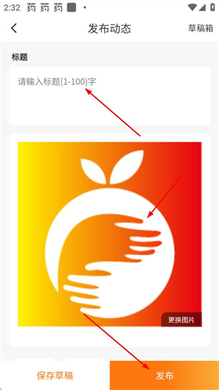 3、在發(fā)布動態(tài)頁面填寫標題、上傳圖片后,點擊發(fā)布按鈕完成動態(tài)發(fā)布。