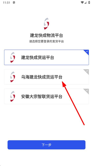 1、在平臺選擇界面,根據(jù)需求選擇對應(yīng)的貨運平臺,如烏海建龍快成貨運平臺,點擊下一步。
