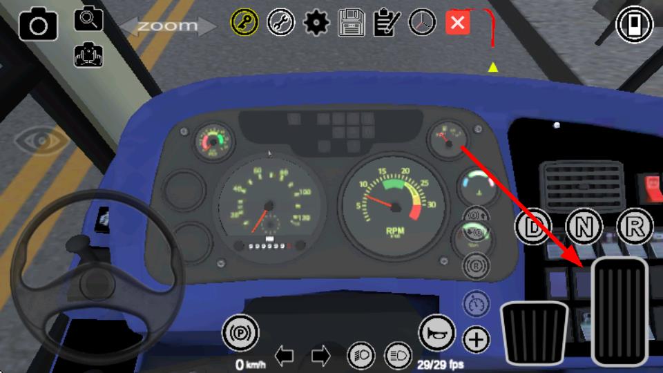 3、進(jìn)入巴士駕駛艙界面后-通過上方的zoom等圖標(biāo)可調(diào)整視角,利用【L】【N】【R】等擋位按鍵結(jié)合方向盤和踏板,來操控巴士在道路上安全行駛。