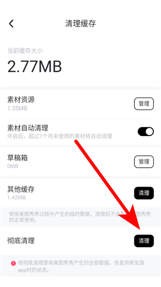 4、可選擇其他緩存后的清理按鈕清理臨時數(shù)據(jù),或點擊徹底清理后的清理按鈕重置應(yīng)用數(shù)據(jù)來完成緩存清理。