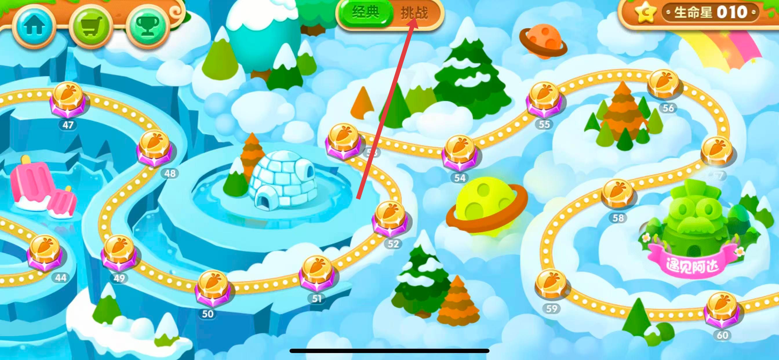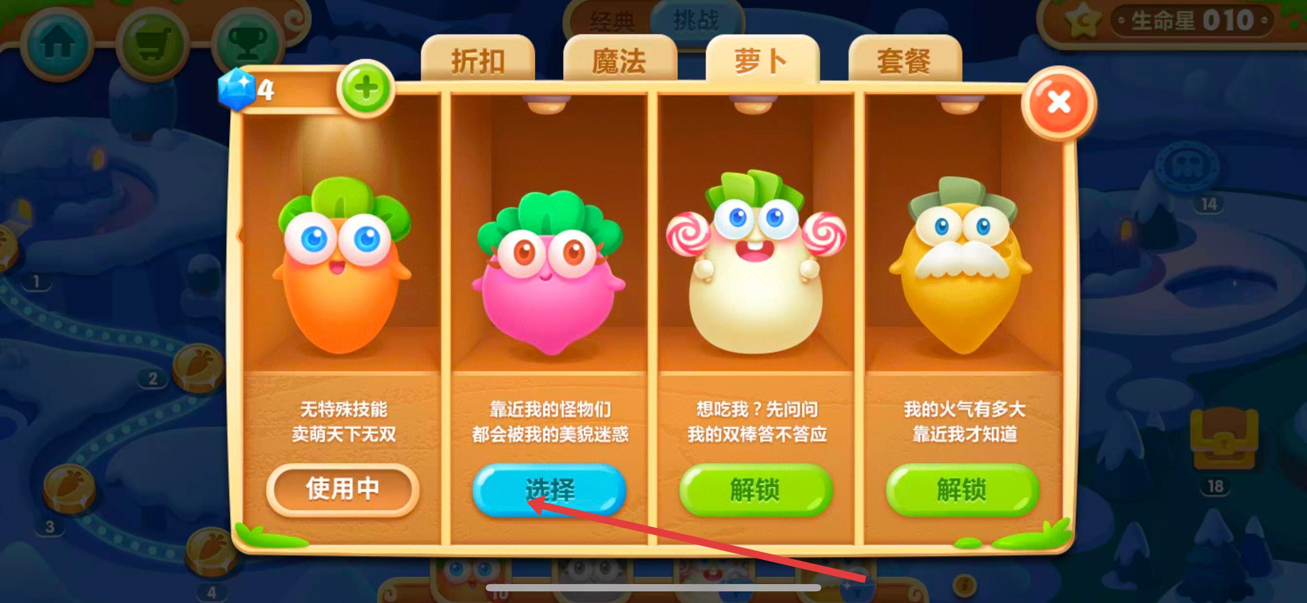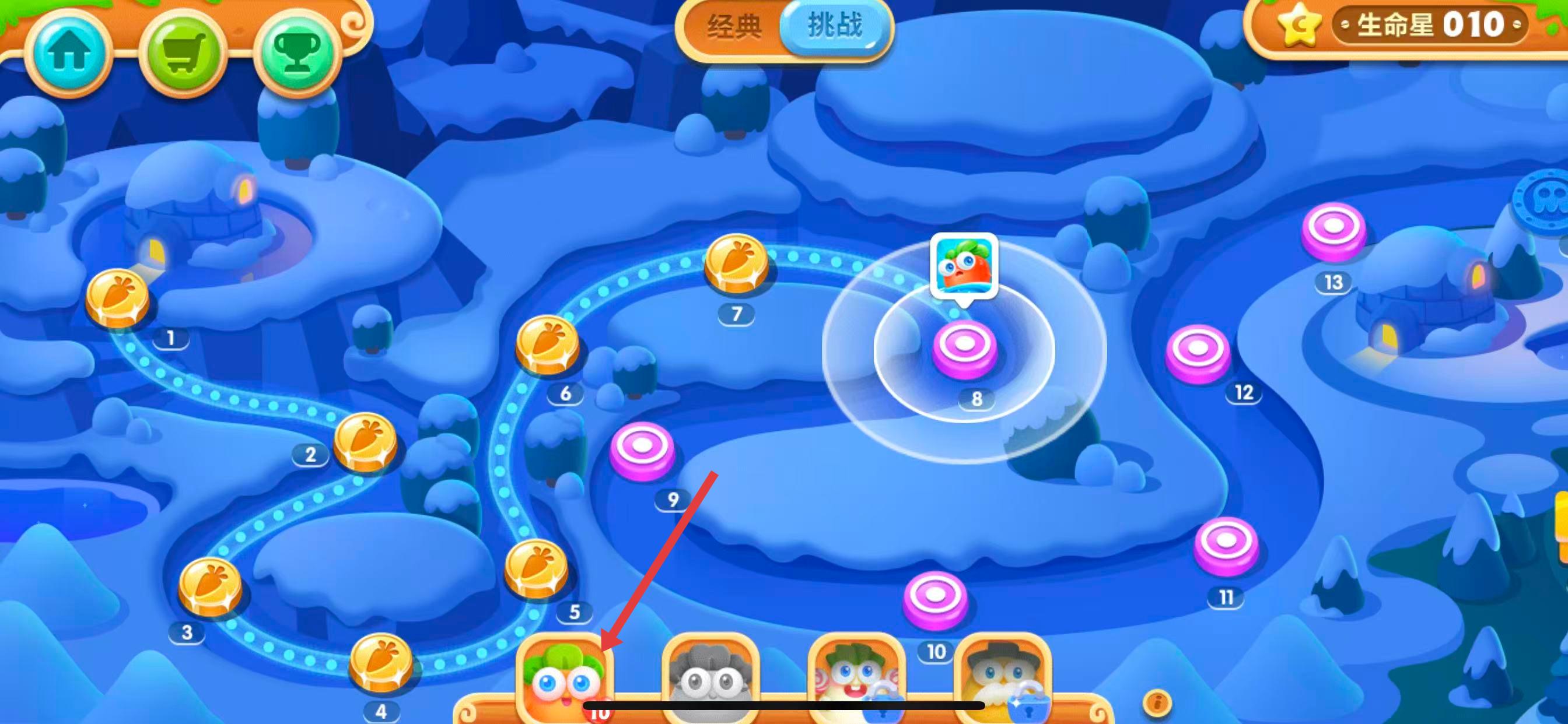 3、在挑戰(zhàn)模式界面下方,找到顯示當(dāng)前蘿卜的圖標(biāo)區(qū)域,點(diǎn)擊該區(qū)域打開蘿卜選擇面板。