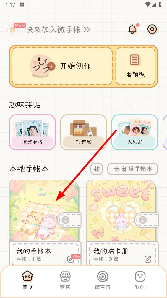 1、打開微手帳app,在首頁的本地手帳本板塊,點(diǎn)擊我的手帳本。