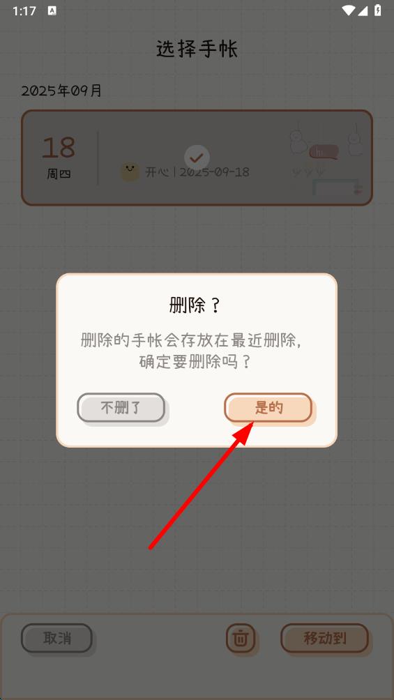 5、在彈出的確認(rèn)刪除提示框中,點(diǎn)擊是的,即可完成手帳刪除。
