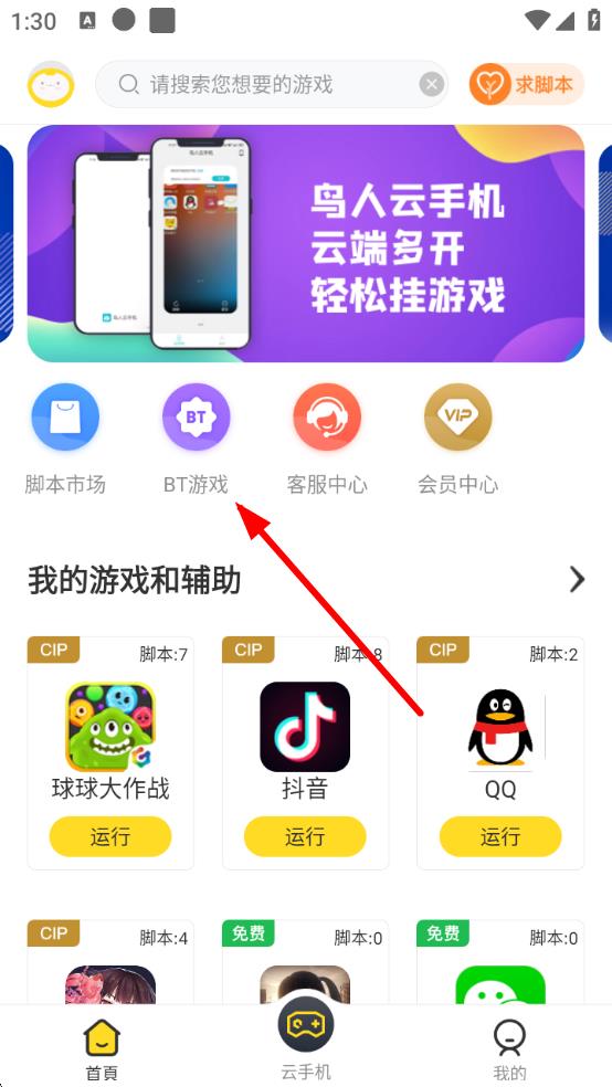1、打開鳥人助手APP,在首頁點擊BT游戲按鈕,進(jìn)入BT游戲界面。