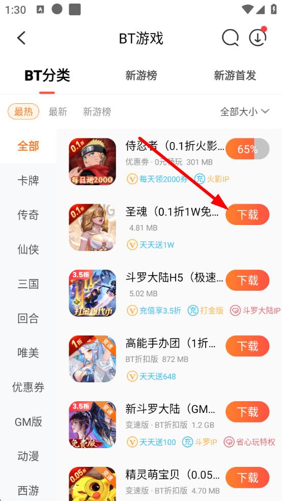 2、在BT游戲界面中,瀏覽各類提供折扣或福利的游戲,找到帶有下載標(biāo)識的免費或低折扣游戲,點擊下載按鈕。