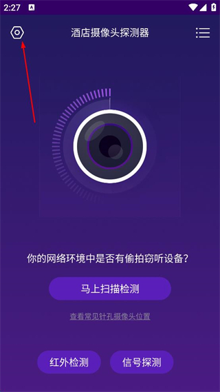 1、打開酒店攝像頭探測器APP,點擊左上角設(shè)置圖標(biāo),進入設(shè)置相關(guān)頁面。