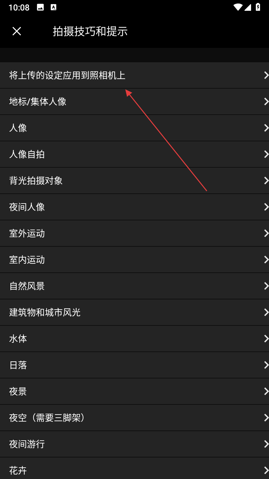 3、在拍攝技巧列表中,可根據(jù)需求選擇不同的拍攝場景,點(diǎn)擊對應(yīng)選項(xiàng)即可查看該場景下的具體拍攝技巧與設(shè)置建議。