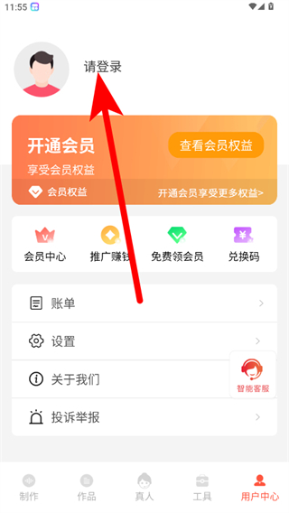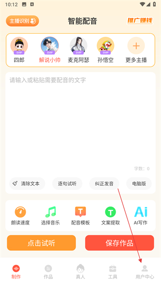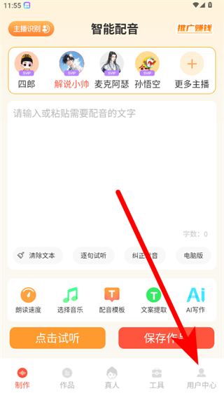 1、在配音鵝制作頁(yè)面,點(diǎn)擊右下角用戶中心選項(xiàng),進(jìn)入用戶中心頁(yè)面。