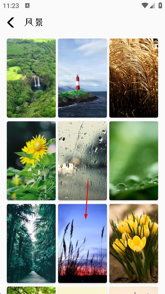 2、在風(fēng)景類壁紙展示頁(yè)面里,挑選出自己喜歡的風(fēng)景壁紙,比如帶有草和天空元素的,點(diǎn)擊該壁紙進(jìn)入詳情頁(yè)面。