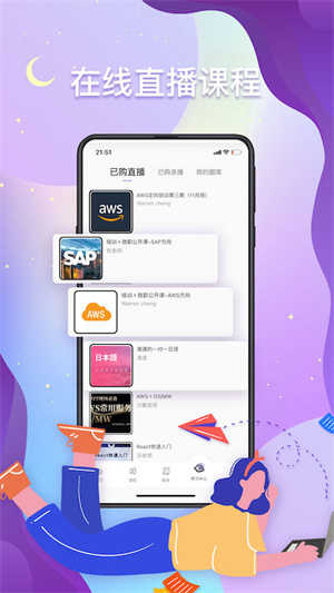 - 直播課程在線觀看,每天都有超多直播課程可以學(xué)習(xí),錯(cuò)過(guò)直播也能觀看對(duì)應(yīng)的錄播課程;