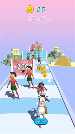 控制人物移動(dòng),在賽道上通過(guò)增加對(duì)應(yīng)年限使人類(lèi)從石器時(shí)代不斷的進(jìn)化到到機(jī)甲時(shí)代,最后通過(guò)進(jìn)化的時(shí)代程度而獲得不同的獎(jiǎng)勵(lì)。注意可以通過(guò)撞擊賽道上的人物獲得額外的的金幣獎(jiǎng)勵(lì)!