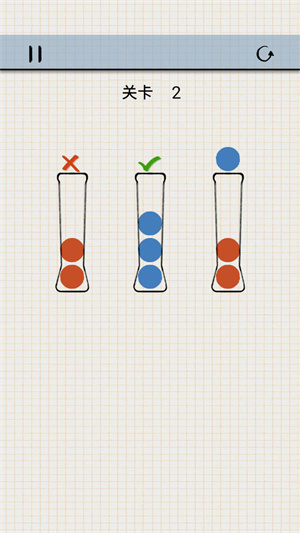 每根試管中都有不同顏色的小球,通過對(duì)管子中相同顏色的小球進(jìn)行分類,嘗試將所有顏色相同的小球都在同一試管中,即可獲得勝利喲~ 游戲玩法看似簡(jiǎn)單,但越到后面需要考慮的步驟越多噢,快來試試看吧~ 只用單指操作,游戲免費(fèi)任你玩,老少皆宜,一起來挑戰(zhàn)吧~