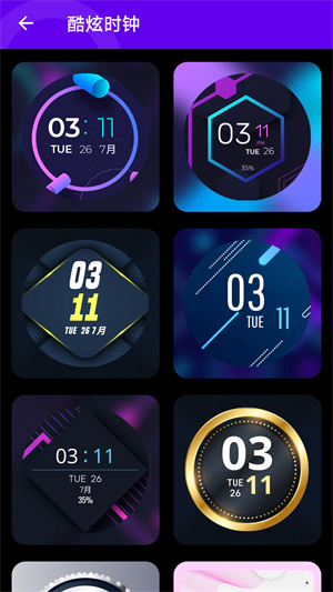 2、時鐘:軟件內含四種時鐘模式,包括模擬時鐘,數(shù)字時鐘,酷炫時鐘和自定義時鐘,每一種時鐘內又包含多種效果,同時您還可以在時鐘原本的基礎上繼續(xù)進行編輯,變成您喜歡的模樣;