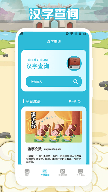 一款有著海量的漢字資源且實(shí)時(shí)更新,超多學(xué)習(xí)漢字的小技巧,幫助大家快速的識(shí)漢字,跟多有趣的互動(dòng)提高大家的學(xué)習(xí)興趣,讓大家快來(lái)的學(xué)習(xí),能夠快速的掌握漢字。