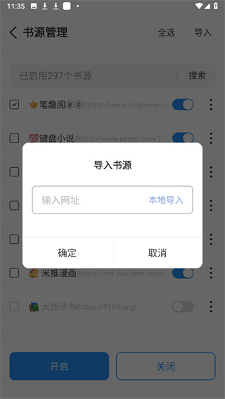 3、粘貼進(jìn)入自己的書(shū)源網(wǎng)址,然后點(diǎn)擊確定,或者通過(guò)本地導(dǎo)入。