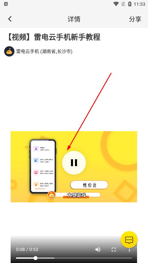 2、進(jìn)入【視頻】雷電云手機(jī)新手教程頁(yè)面,點(diǎn)擊視頻播放按鈕,能觀看教程視頻,了解雷電云手機(jī)基本使用方法。