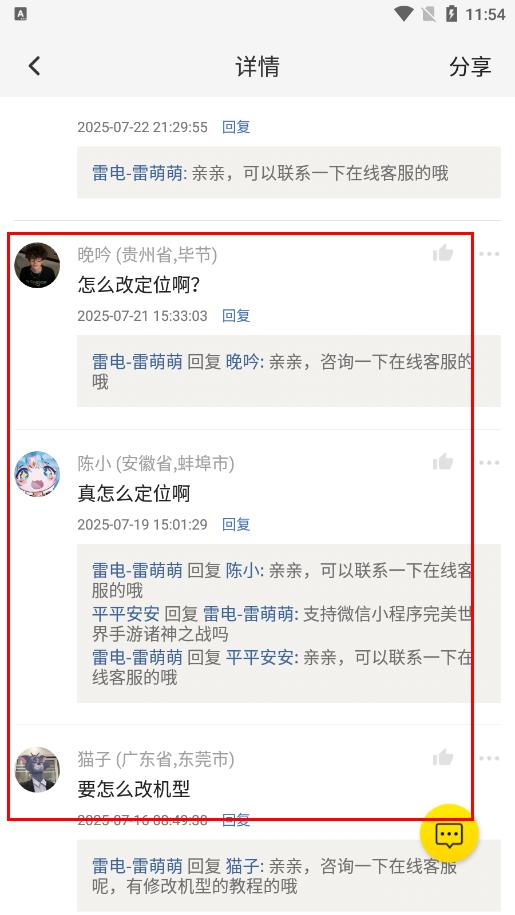 4、在評(píng)論區(qū)中,能看到關(guān)于改定位、改機(jī)型等具體操作的用戶提問及官方客服的回復(fù),可進(jìn)一步了解相關(guān)操作方法。