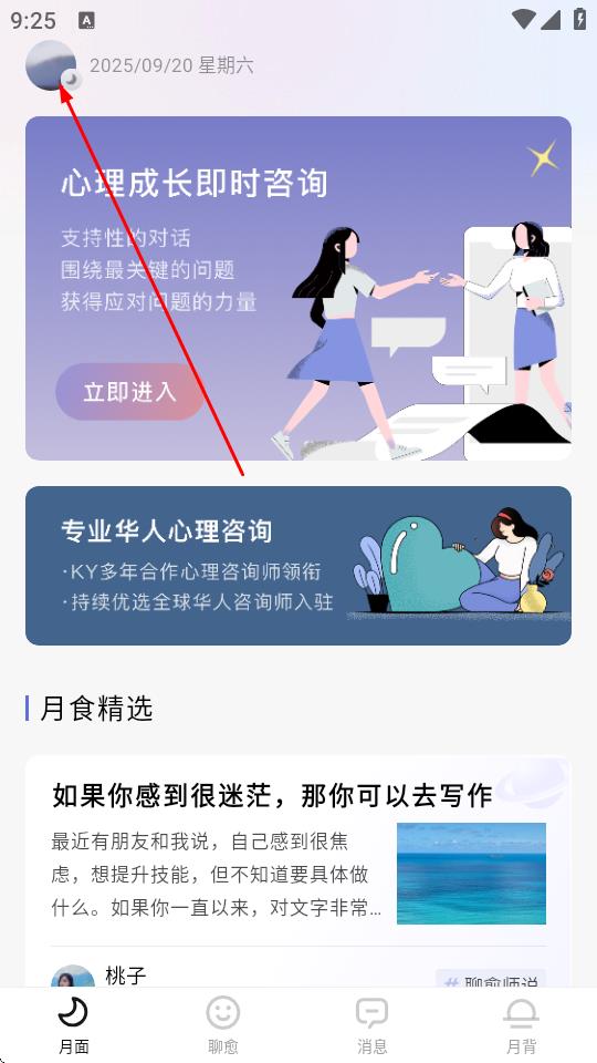 1、打開(kāi)月食APP,點(diǎn)擊左上角的頭像圖標(biāo),展開(kāi)個(gè)人菜單界面。
