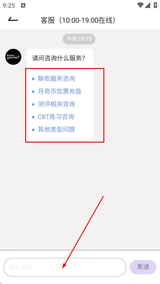 3、進(jìn)入客服對(duì)話界面后,會(huì)看到常見(jiàn)的服務(wù)咨詢類別,或點(diǎn)擊下方輸入框。