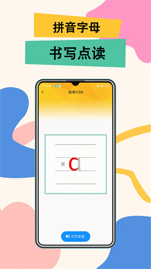 - 每個拼音都有拼音練習課程根據(jù)筆畫,還有各種各樣的測試模式,學習完簡單的測試;