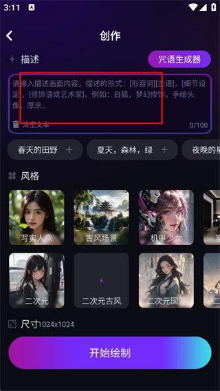 2、點(diǎn)擊描述輸入框,在輸入框中填寫繪畫需求。