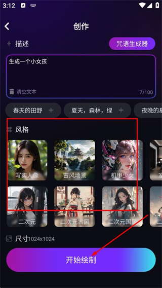 3、選擇風(fēng)格,點(diǎn)擊開始繪制按鈕即可進(jìn)行繪畫。