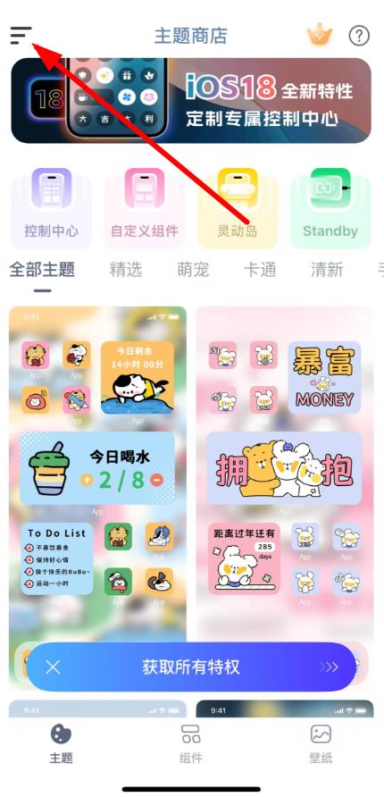 1、打開(kāi)主題壁紙桌面應(yīng)用進(jìn)入主題商店界面,點(diǎn)擊左上角三條橫線圖標(biāo)。
