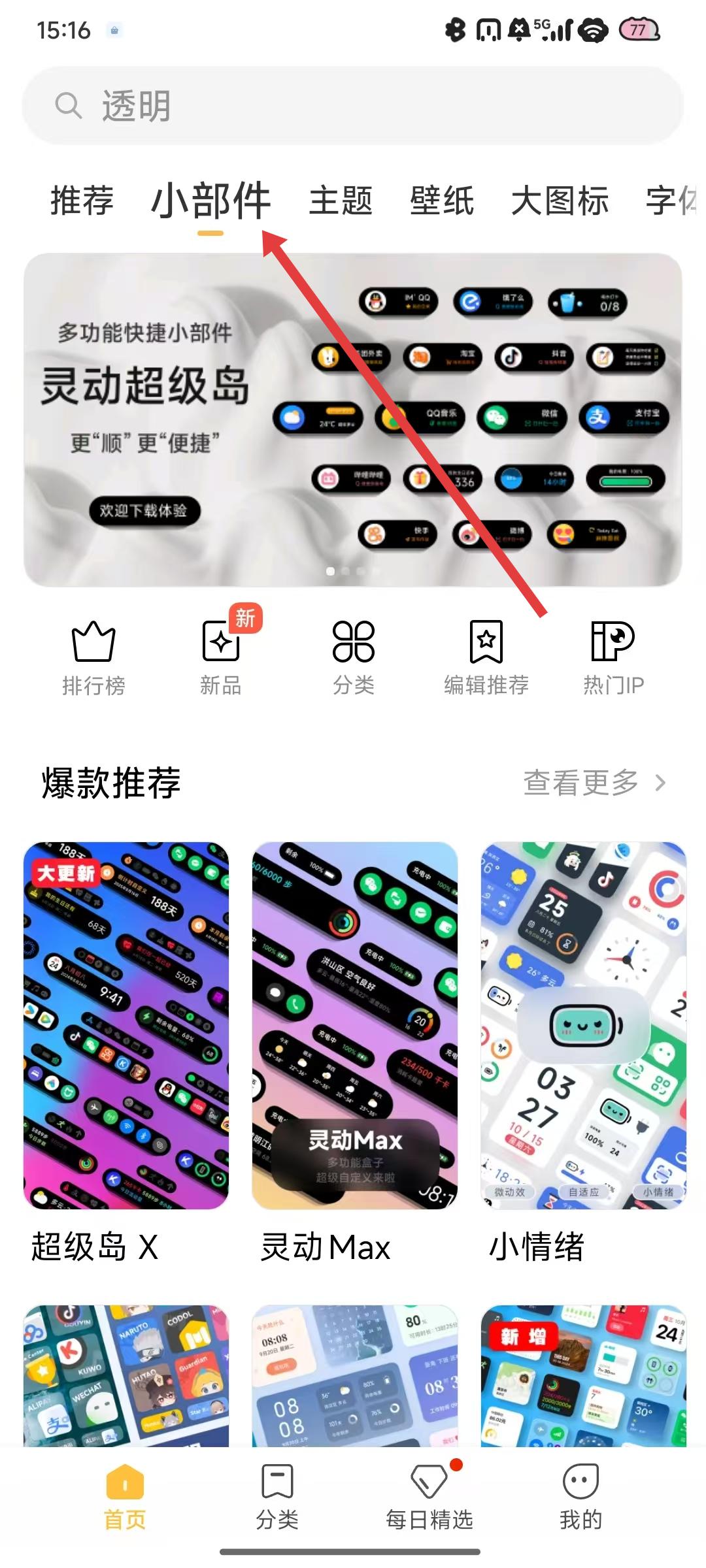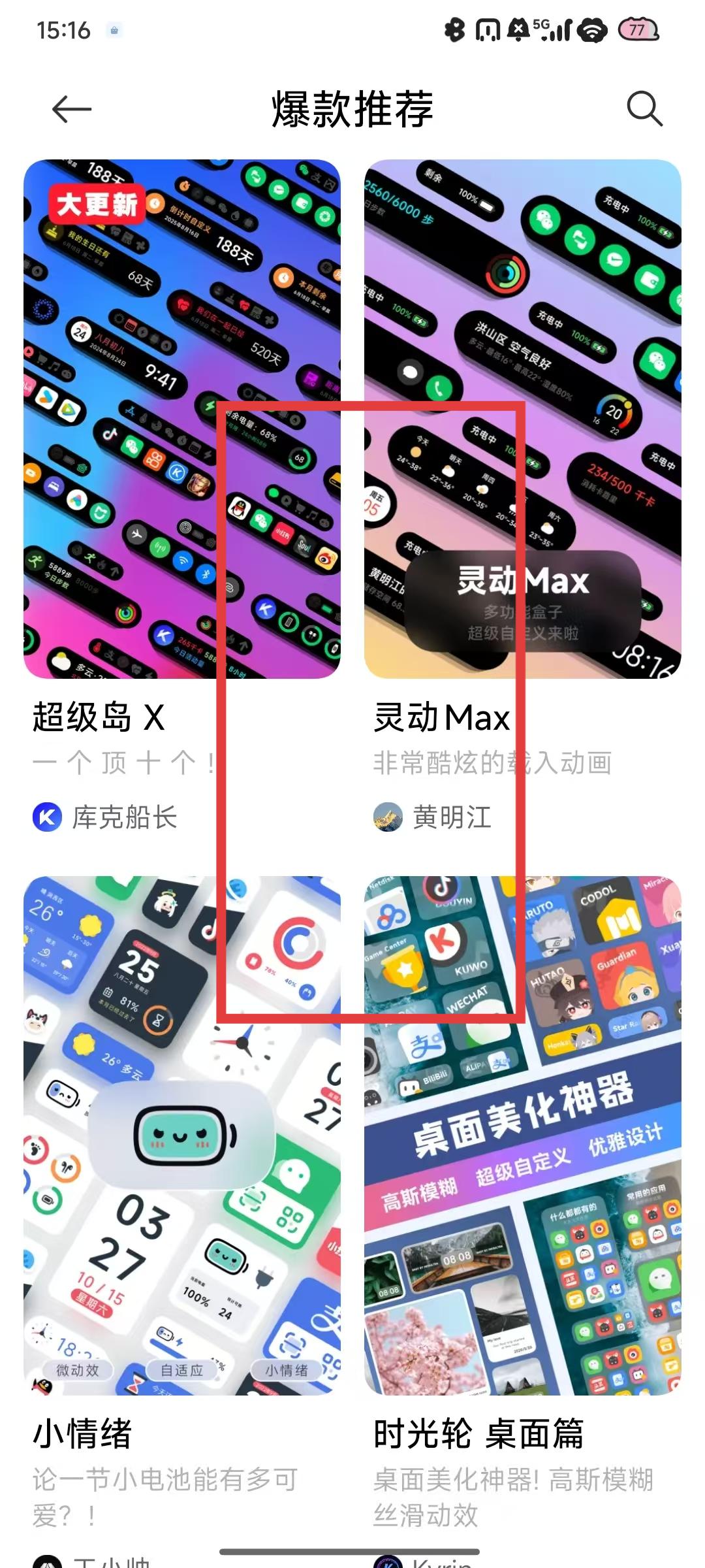 2、在小組件選擇頁面的爆款推薦等板塊中,瀏覽如靈動Max】等各種小組件,找到自己喜歡的小組件。