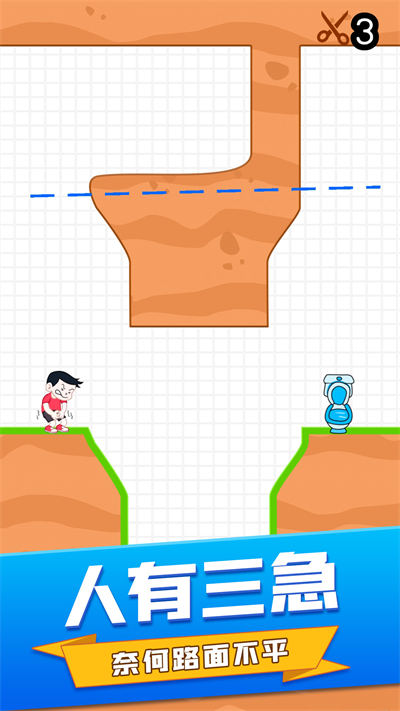 畫線消除是一款休閑闖關類游戲,游戲中的一個小男孩急著要上廁所,但是在去往廁所的路上出現(xiàn)了一個很大的天坑,玩家需要通過切除上方的石塊,讓石塊掉落下來并且完美的填滿地上的坑,讓小男孩能夠成功去到廁所,如果切割的石塊形狀和下方的坑不符合,小男孩無法通過,則算游戲失敗。