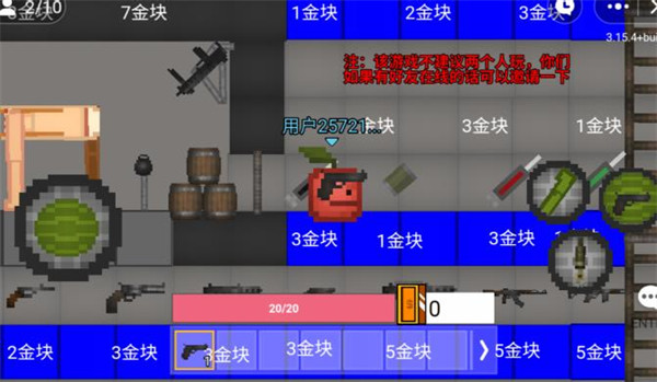甜瓜VS蘋果手機(jī)版是一款聯(lián)機(jī)游戲,玩家可以和自己的好朋友聯(lián)網(wǎng)一起玩,游戲采用的是沙盒游戲的經(jīng)典玩法,玩家可以自由的利用游戲中的一些道具,建立自己的生存空間,一起輕松玩耍的同時(shí),又能感受到熱血,快來加入吧!