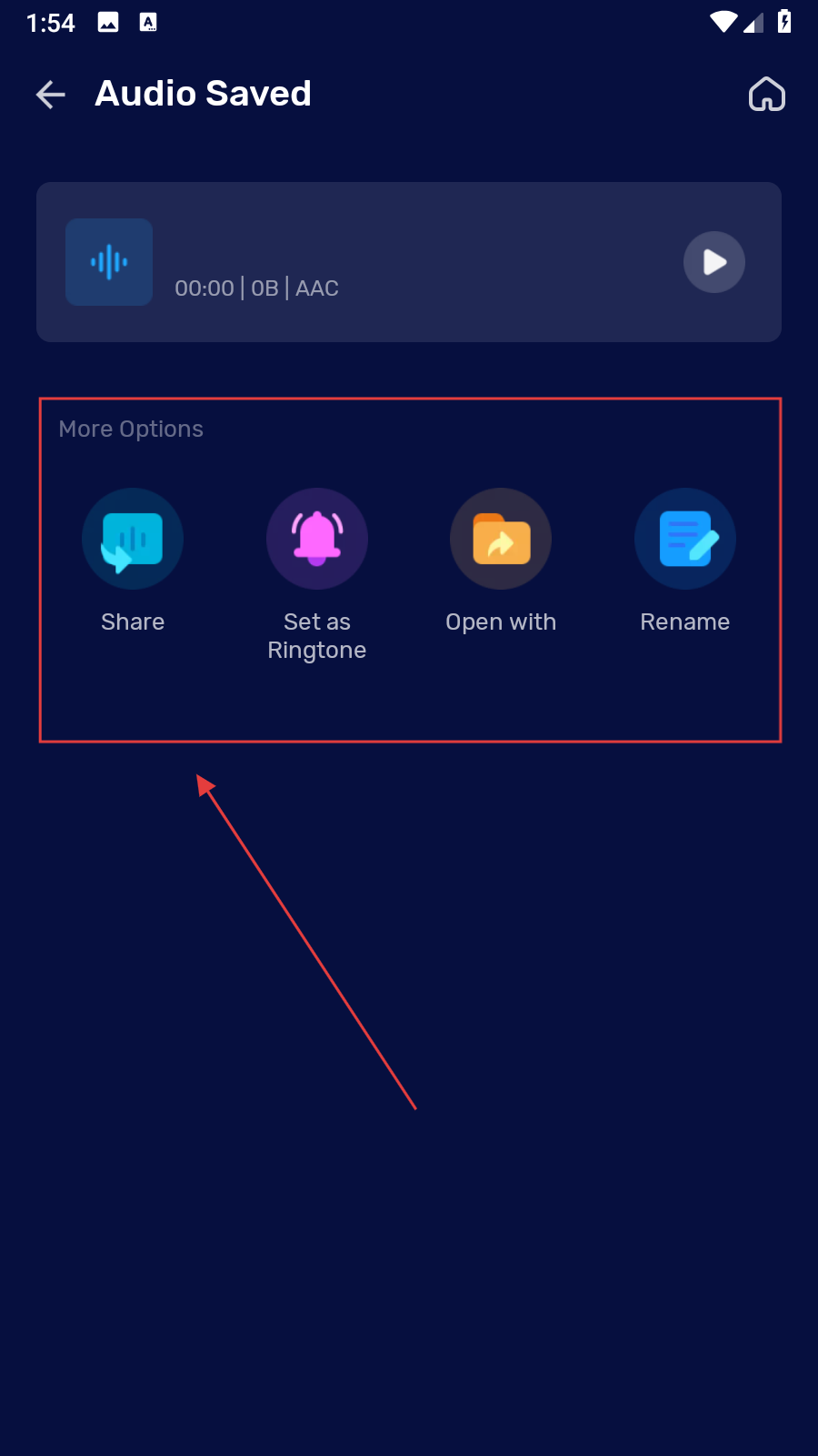4、錄音完成后,會(huì)進(jìn)入音頻保存或處理頁面,可根據(jù)需求對(duì)錄制好的音頻進(jìn)行分享、設(shè)為鈴聲、重命名等操作。