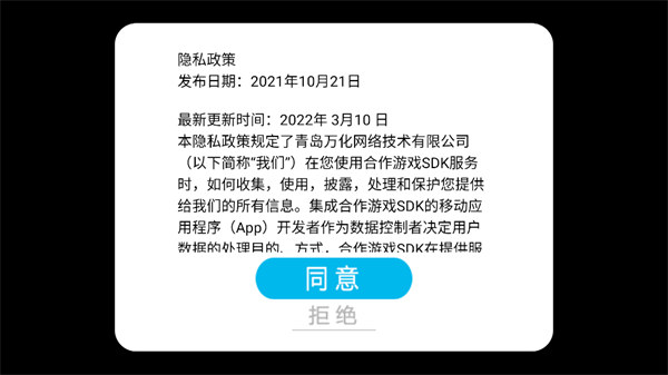 1、打開游戲之后閱讀隱私政策和用戶協(xié)議,點(diǎn)擊同意之后就能進(jìn)入到游戲里面;