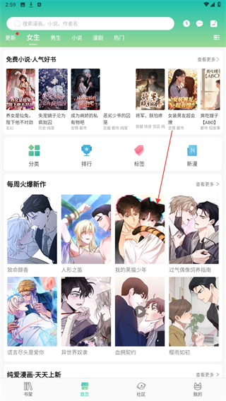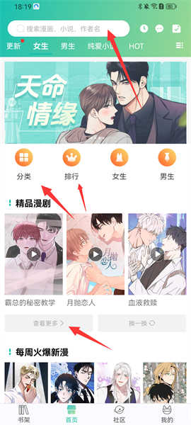 1、首先進(jìn)入軟件首頁(yè),首頁(yè)就有著豐富的漫畫資源,以及不同的漫畫分類,最簡(jiǎn)單的方式就是直接點(diǎn)擊上方的搜索框,屬兔麻花、小說(shuō)、作者等進(jìn)行搜索,也可以直接通過(guò)軟件精選推薦去查找感興趣的漫畫內(nèi)容,點(diǎn)擊“查看更多”還有更加豐富的漫畫資源;