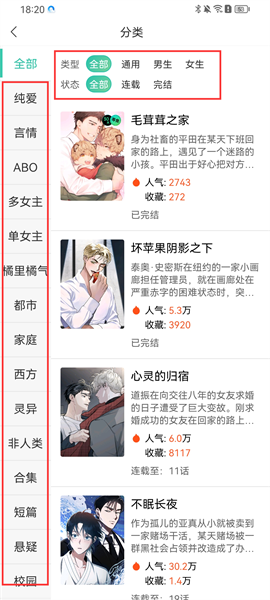 2、在【分類】板塊,將所有的漫畫根據(jù)不同的題材類型以及更新狀態(tài)進(jìn)行細(xì)致劃分,便于用戶快速篩選;